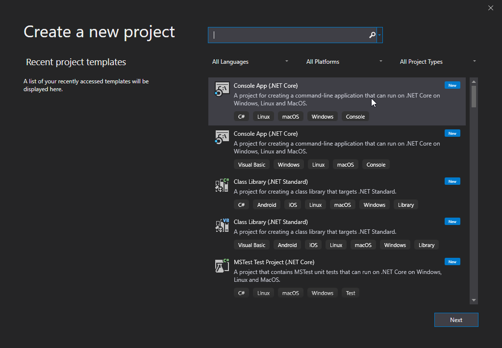 Choose "Console App (.NET Core)" from the list and click on the Next button: