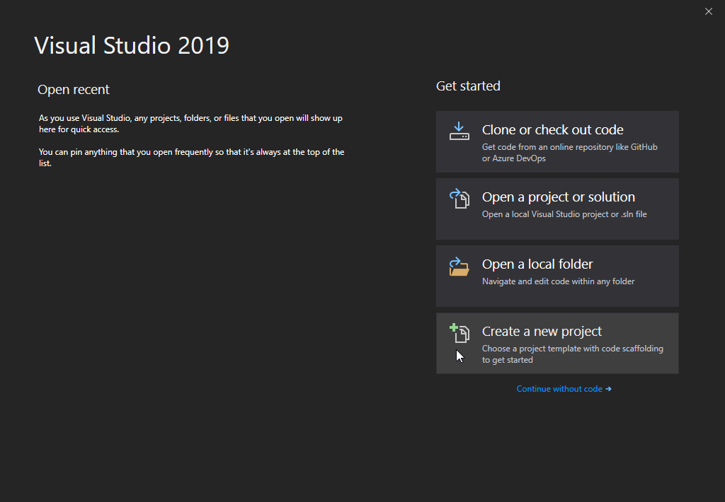 On the start window, choose Create a new project: