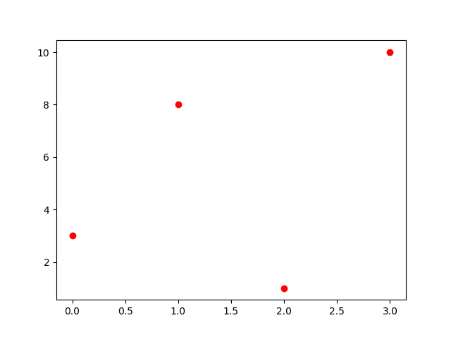 #Three lines to make our compiler able to draw: import sys import matplotlib matplotlib.use('Agg') import matplotlib.pyplot as plt import numpy as np ypoints = np.array([3, 8, 1, 10]) plt.plot(ypoints, 'or') plt.show() #Two lines to make our compiler able to draw: plt.savefig(sys.stdout.buffer) sys.stdout.flush()