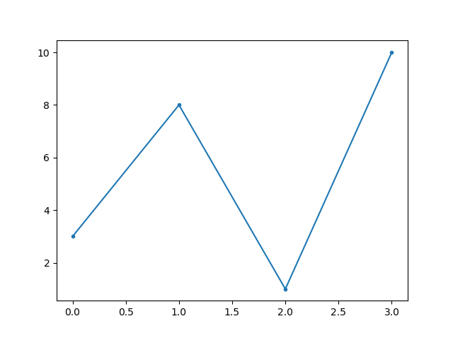 #Three lines to make our compiler able to draw: import sys import matplotlib matplotlib.use('Agg') import matplotlib.pyplot as plt import numpy as np ypoints = np.array([3, 8, 1, 10]) plt.plot(ypoints, marker = '.') plt.show() #Two lines to make our compiler able to draw: plt.savefig(sys.stdout.buffer) sys.stdout.flush()